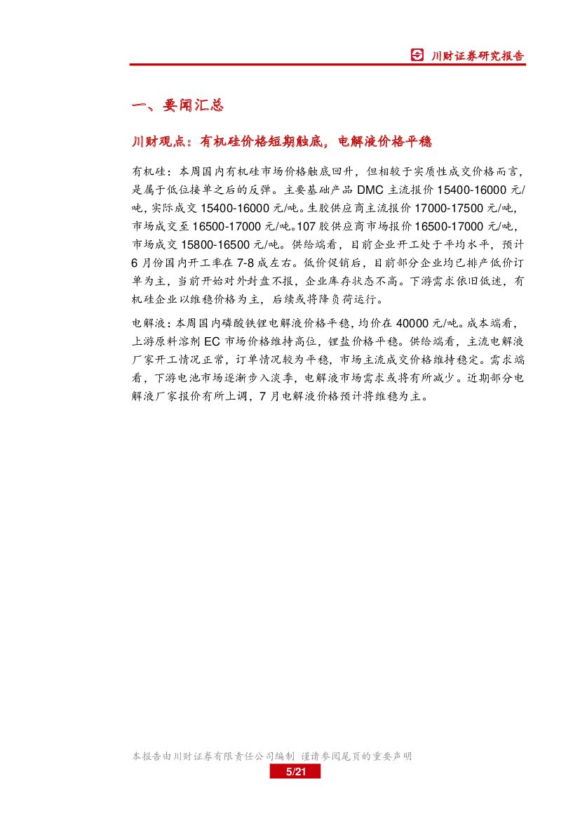 川财证券:基础化工行业周报:有机硅价格短期触底,电解液价格平稳.pdf