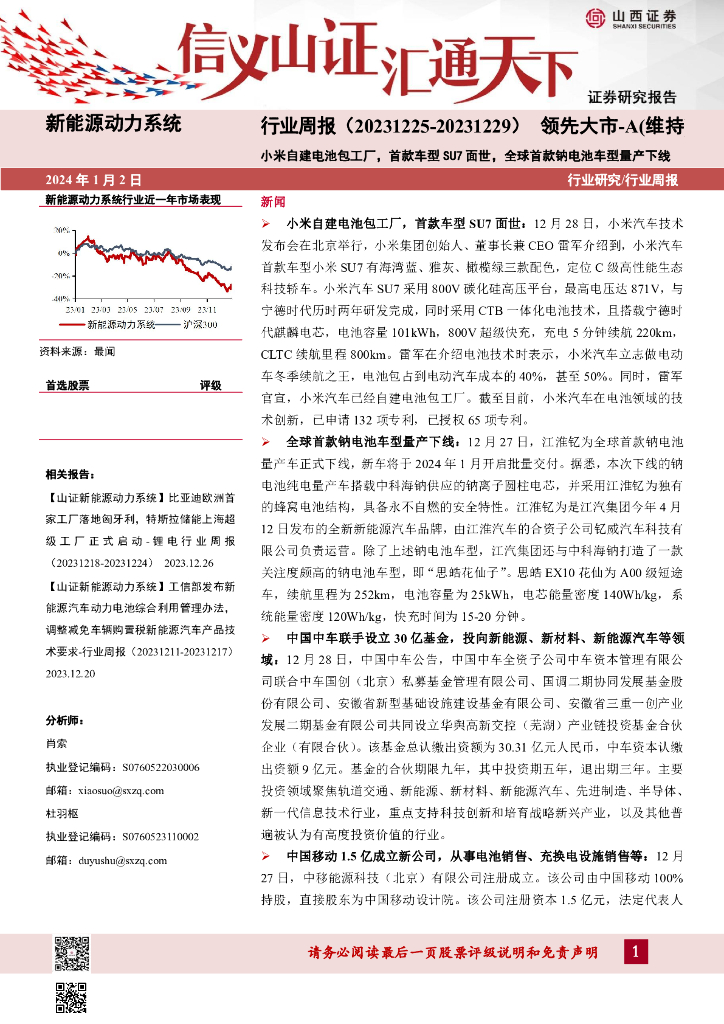 山西证券:新能源动力系统行业周报:小米自建电池包工厂,首款车型SU7面世,全球首款钠电池车型量产下线.pdf
