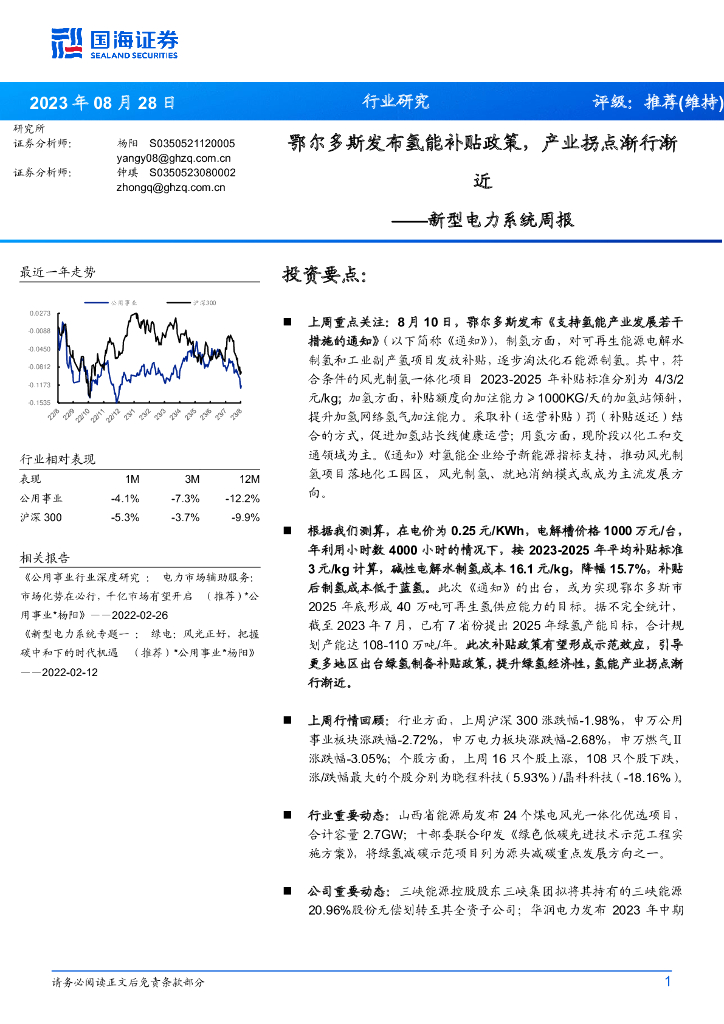 国海证券:新型电力系统周报:鄂尔多斯发布氢能补贴政策,产业拐点渐行渐近.pdf