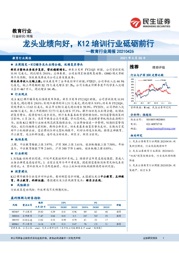 民生证券:教育行业周报:龙头业绩向好,K12培训行业砥砺前行.pdf