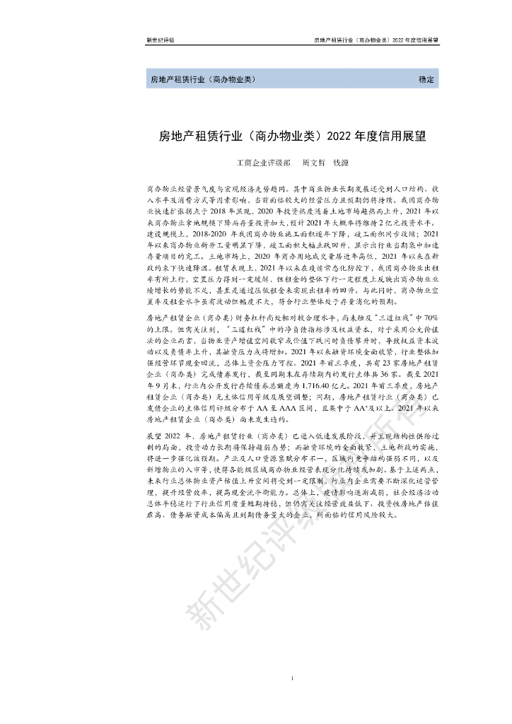 新世纪评级:房地产租赁行业(商办物业类)2022年度信用展望.pdf