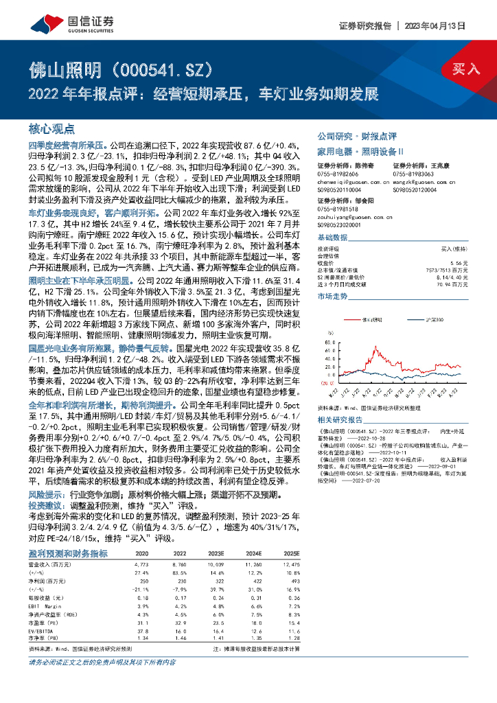 国信证券:佛山照明(000541)-2022年年报点评:经营短期承压,车灯业务如期发展.pdf
