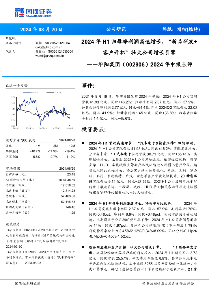 国海证券:华阳集团(002906)-2024年中报点评:2024年H1归母净利润高速增长,“新品研发+客户开拓”壮大公司增长引擎.pdf
