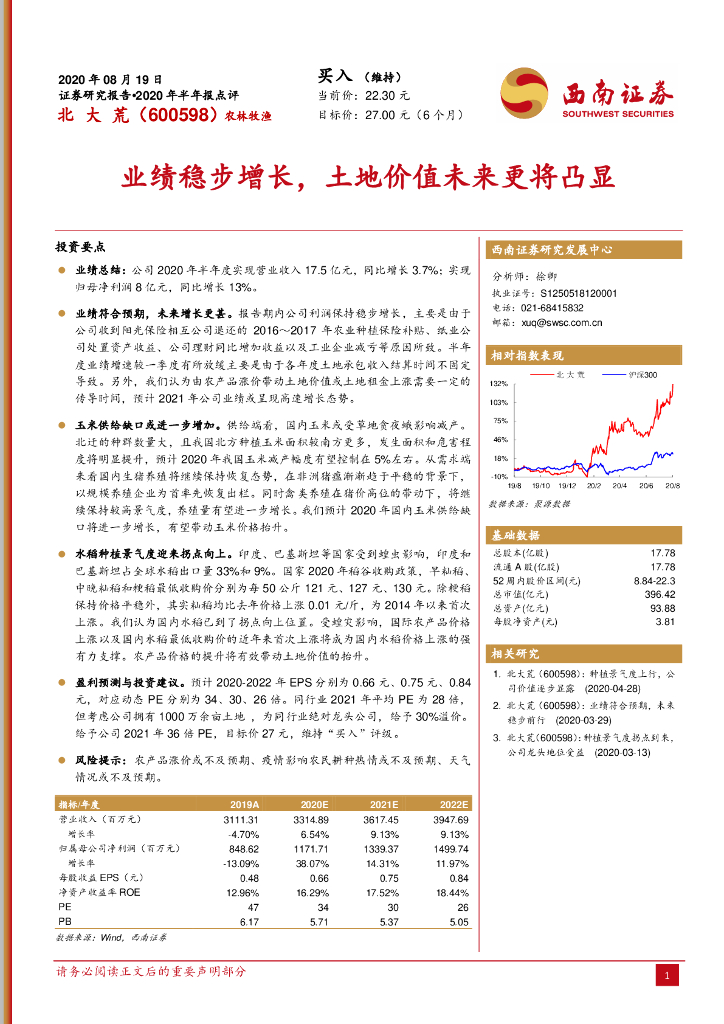 西南证券:北大荒(600598)-业绩稳步增长,土地价值未来更将凸显.pdf