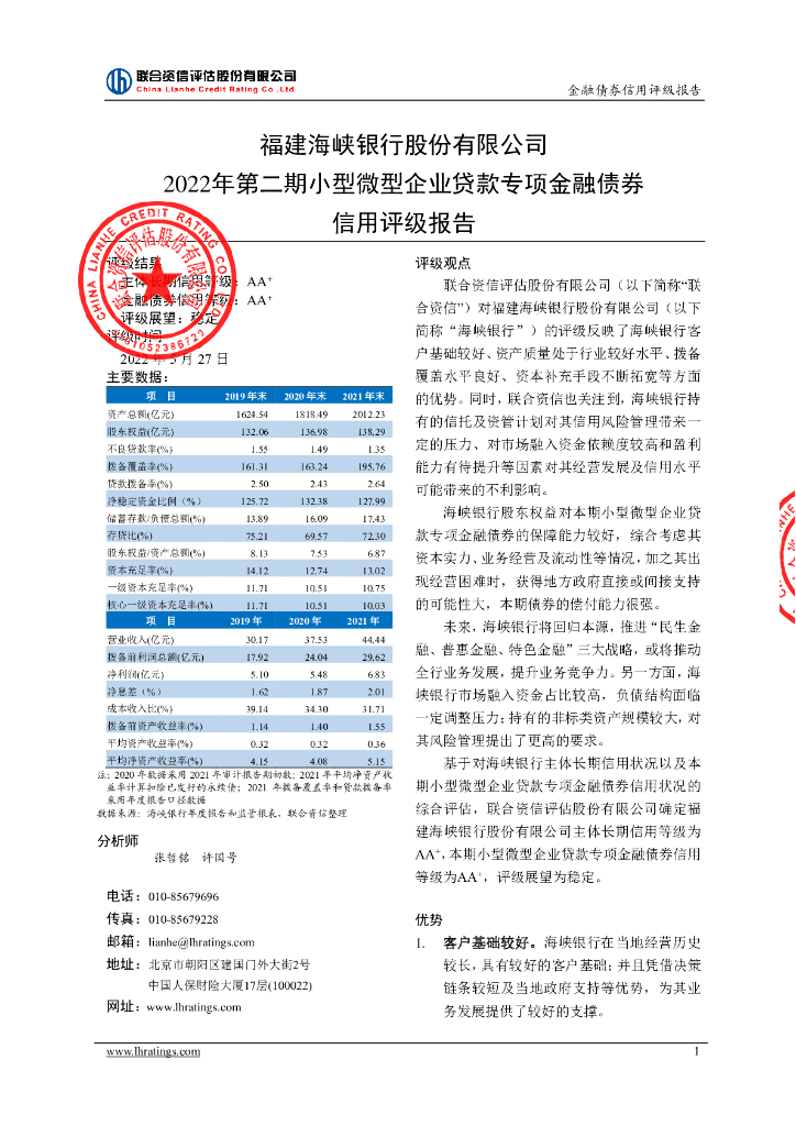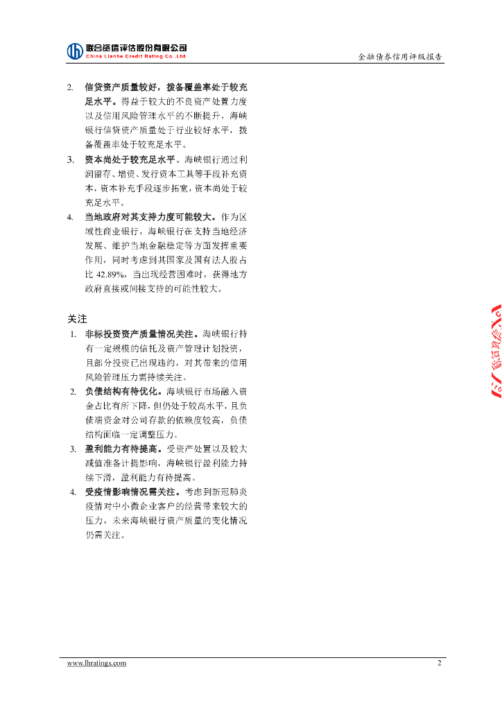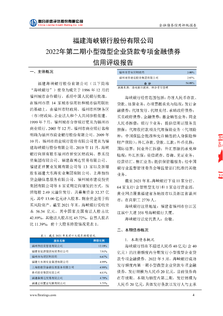 联合资信:福建海峡银行股份有限公司2022年第二期小型微型企业贷款专项金融债券信用评级报告及跟踪评级安排说明.pdf