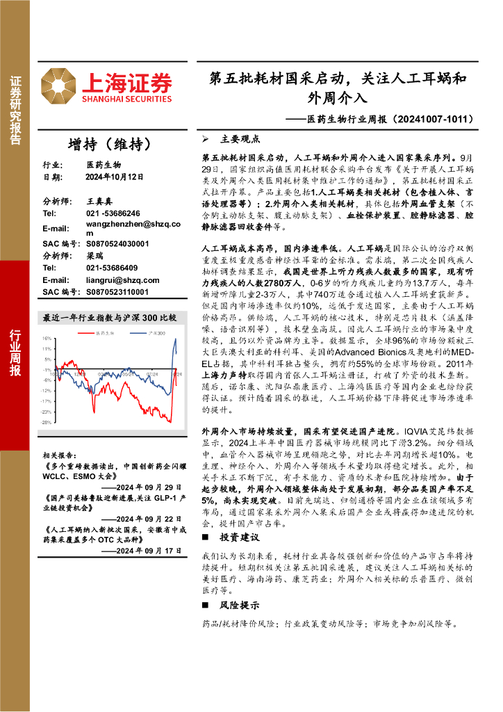 上海证券:医药生物行业周报:第五批耗材国采启动,关注人工耳蜗和外周介入.pdf