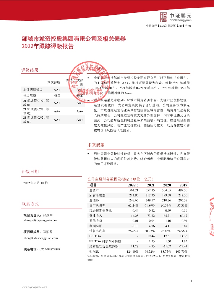 鹏元:邹城市城资控股集团有限公司及相关债券2022年跟踪评级报告.pdf