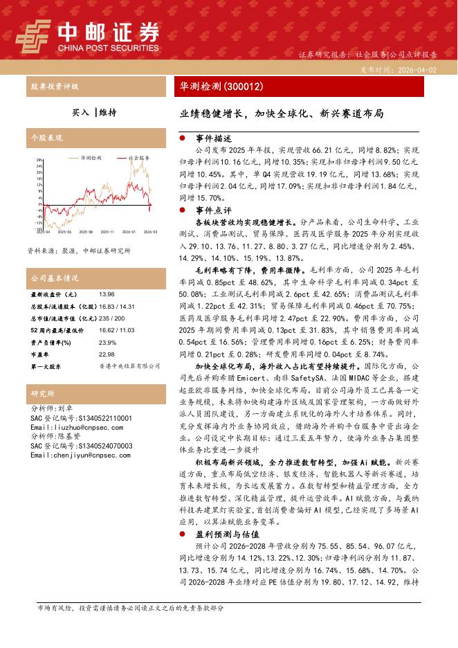 中邮证券:华测检测(300012)-业绩稳健增长,加快全球化、新兴赛道布局.pdf