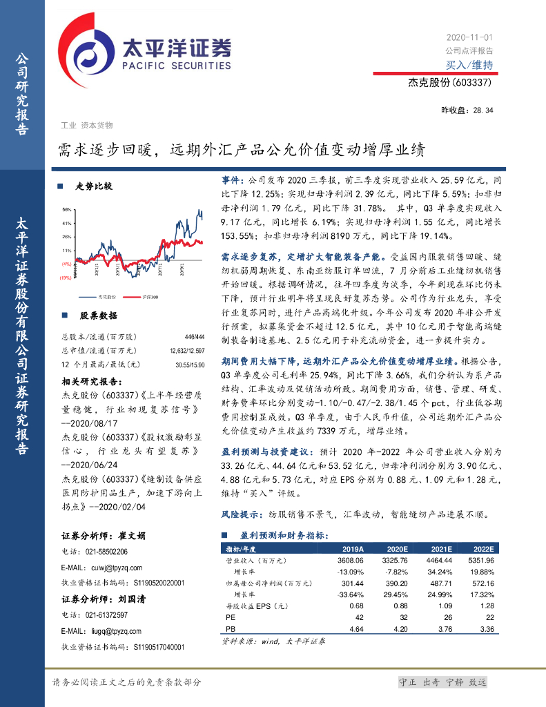 太平洋证券:杰克股份(603337)-需求逐步回暖,远期外汇产品公允价值变动增厚业绩.pdf