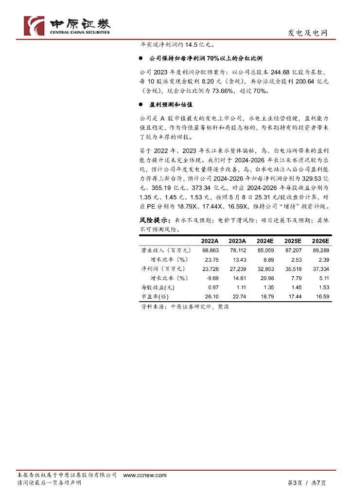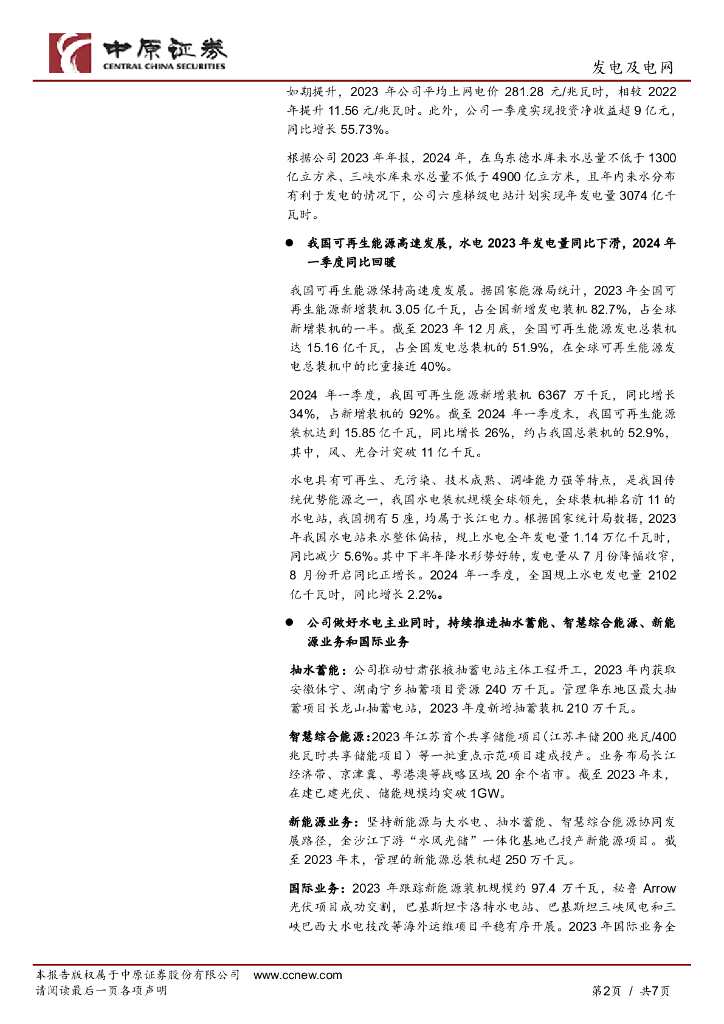 中原证券:长江电力(600900)-2023年年报及2024年一季:乌白电站注入后,公司抗风险能力增强,盈利能力将逐步提升.pdf