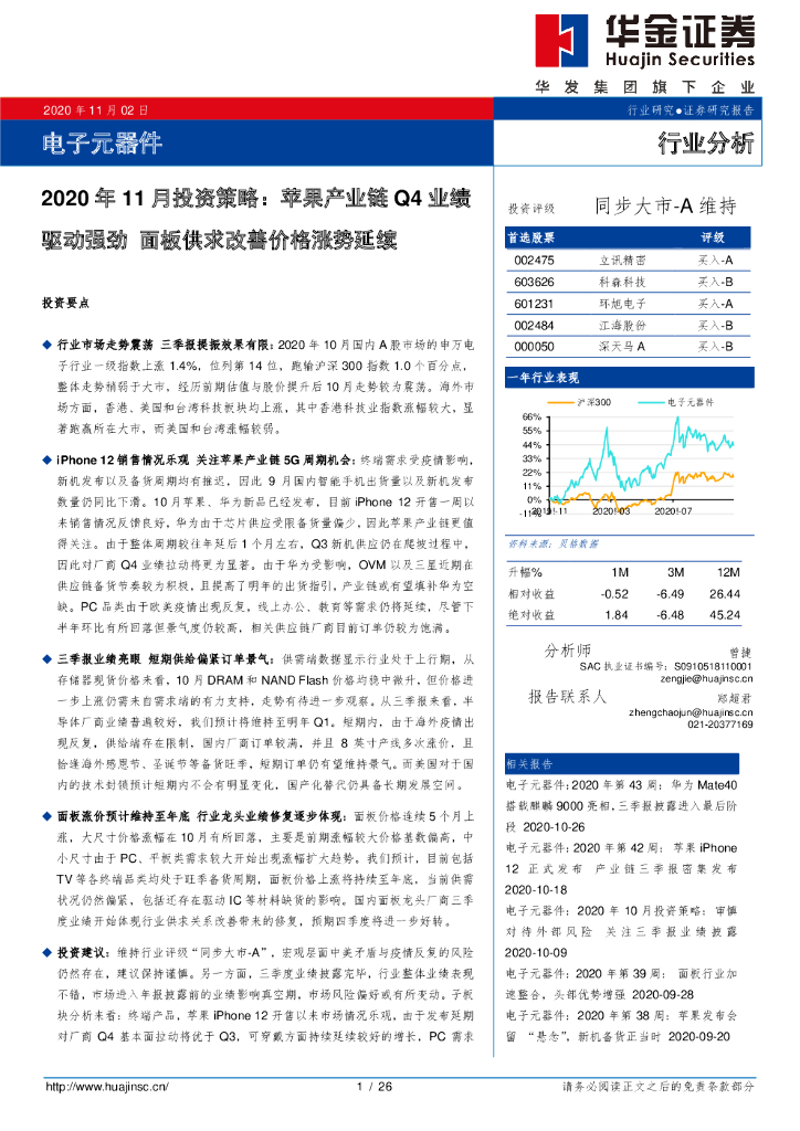 华金证券:电子元器件2020年11月投资策略:苹果产业链Q4业绩驱动强劲 面板供求改善价格涨势延续.pdf