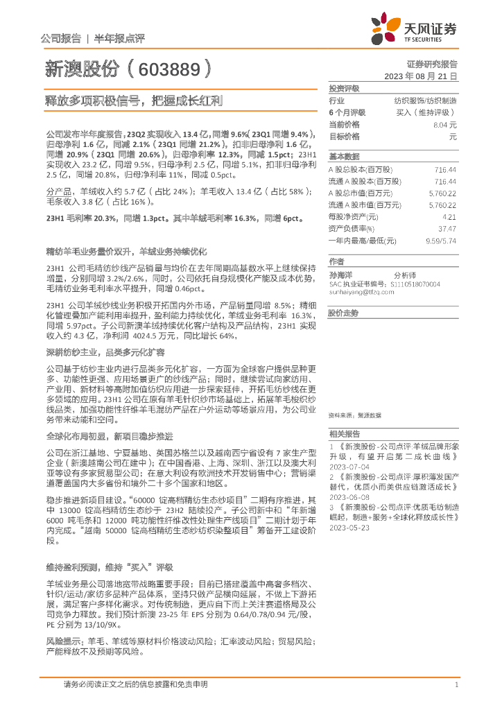 天风证券:新澳股份(603889)-释放多项积极信号,把握成长红利.pdf