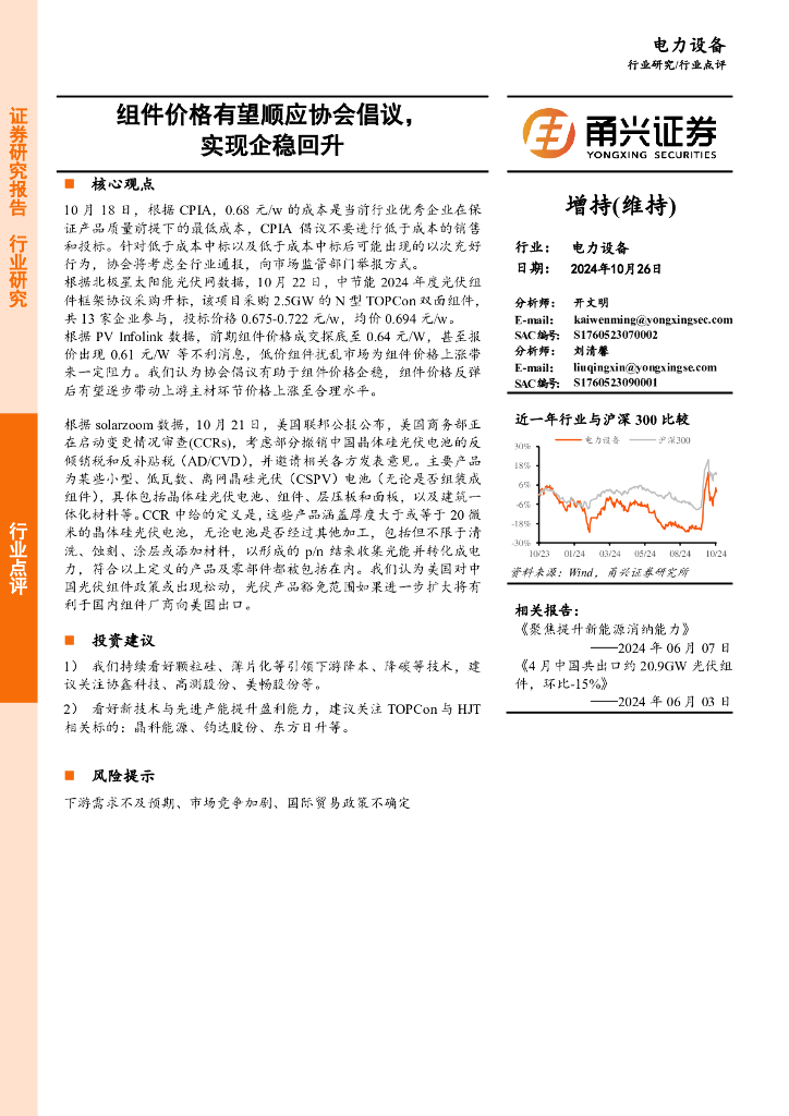 甬兴证券:电力设备行业:组件价格有望顺应协会倡议,实现企稳回升.pdf