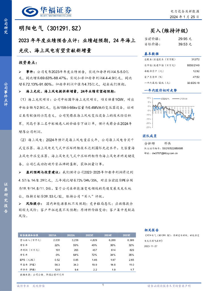 华福证券:明阳电气(301291)-2023年年度业绩预告点评:业绩超预期,24年海上光伏、海上风电有望贡献新增量.pdf