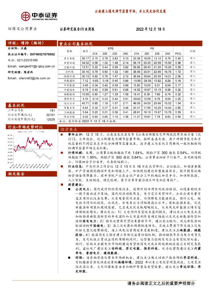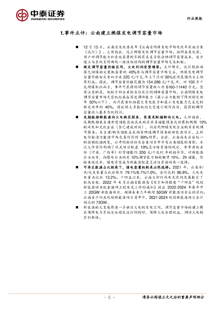 中泰证券:环保及公用事业行业周报:云南建立煤电调节容量市场,水火风光协同发展.pdf