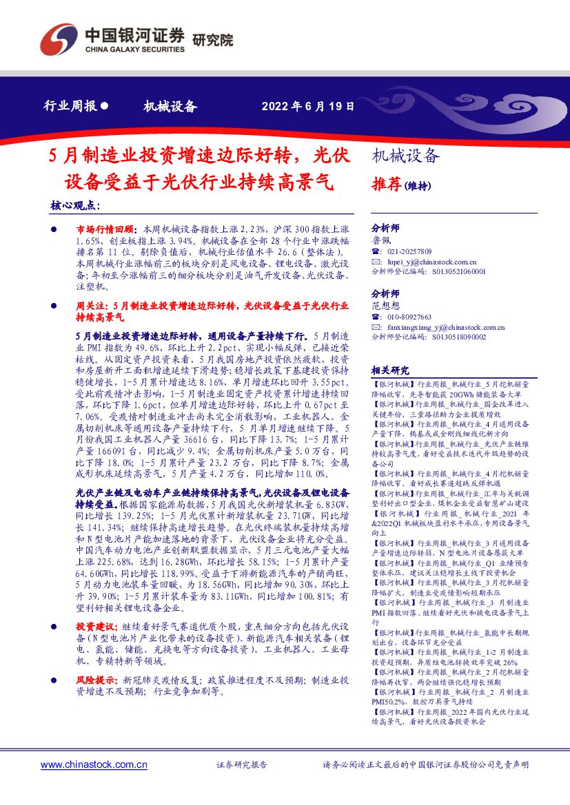 中国银河:机械设备行业周报:5月制造业投资增速边际好转,光伏设备受益于光伏行业持续高景气.pdf