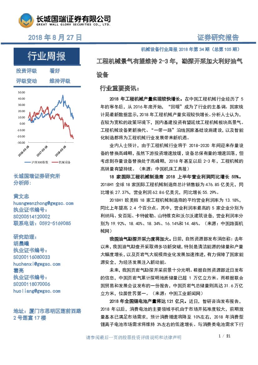 长城国瑞证券:机械设备行业周报2018年第34期(总第105期):工程机械景气有望维持2-3 年,勘探开采加大利好油气设备.pdf