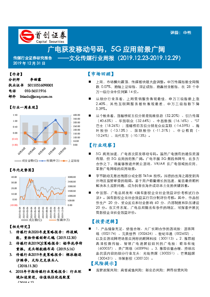 首创证券:文化传媒行业周报:广电获发移动号码 5G应用前景广阔.pdf