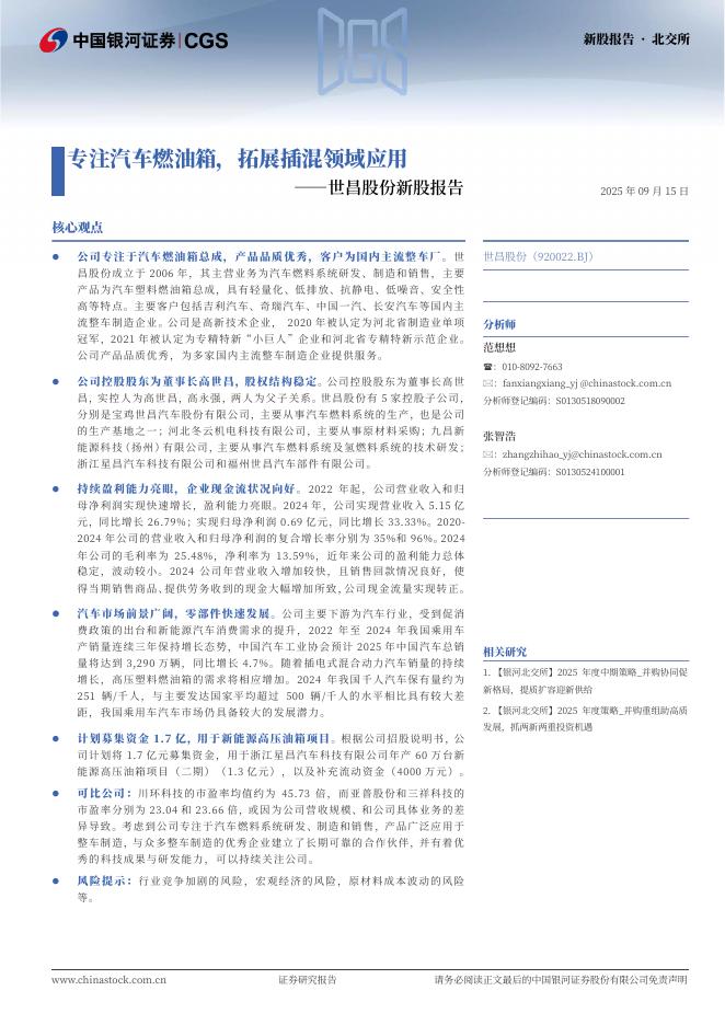 中国银河:世昌股份新股报告:专注汽车燃油箱,拓展插混领域应用-250919.pdf