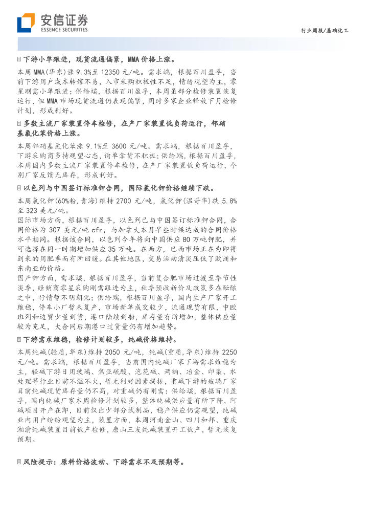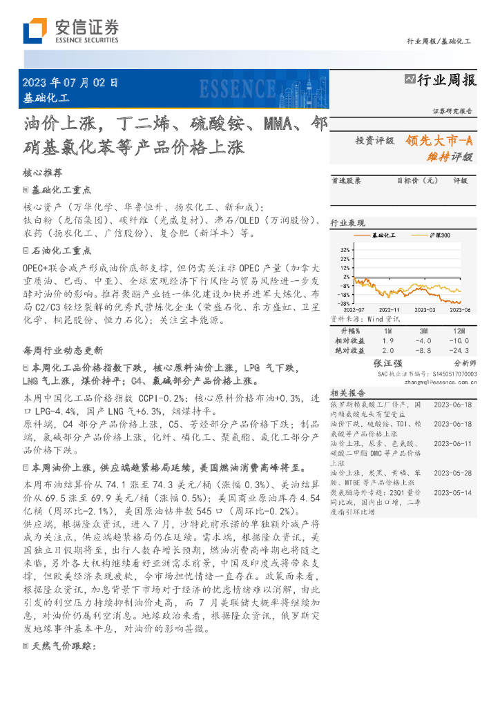 安信证券:基础化工行业周报;油价上涨,丁二烯、硫酸铵、MMA、邻硝基氯化苯等产品价格上涨.pdf