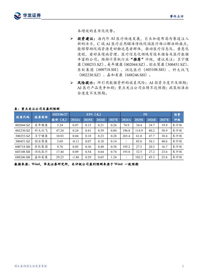 华龙证券:计算机行业点评报告:蚂蚁集团推出AI医疗C端产品,关注AI+医疗投资机会.pdf