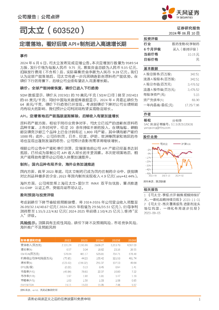 天风证券:司太立(603520)-定增落地,看好后续API+制剂进入高速增长期.pdf
