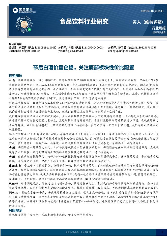 国金证券:食品饮料行业研究:节后白酒价盘企稳,关注底部板块性价比配置.pdf