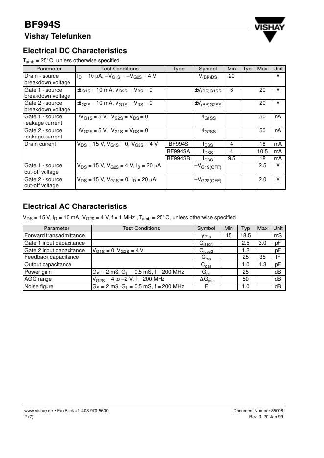 VISHAY BF994S N–Channel Dual Gate MOS-Fieldeffect Tetrode, Depletion Mode 数据手册.pdf