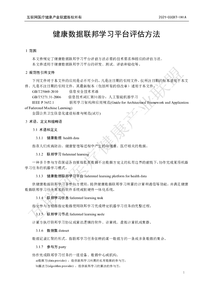 互联网医疗健康产业联盟:健康数据流通基础能力评估方法:第2部分健康数据联邦学习平台.pdf