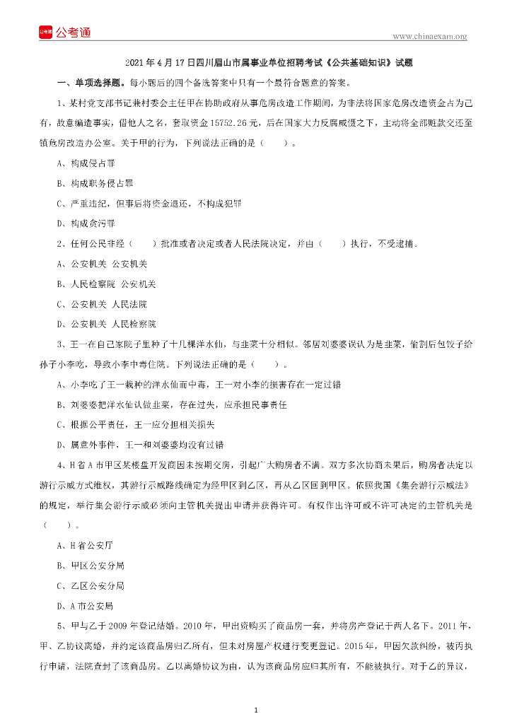 2021年4月17日四川眉山市属事业单位招聘考试《公共基础知识》试题.pdf