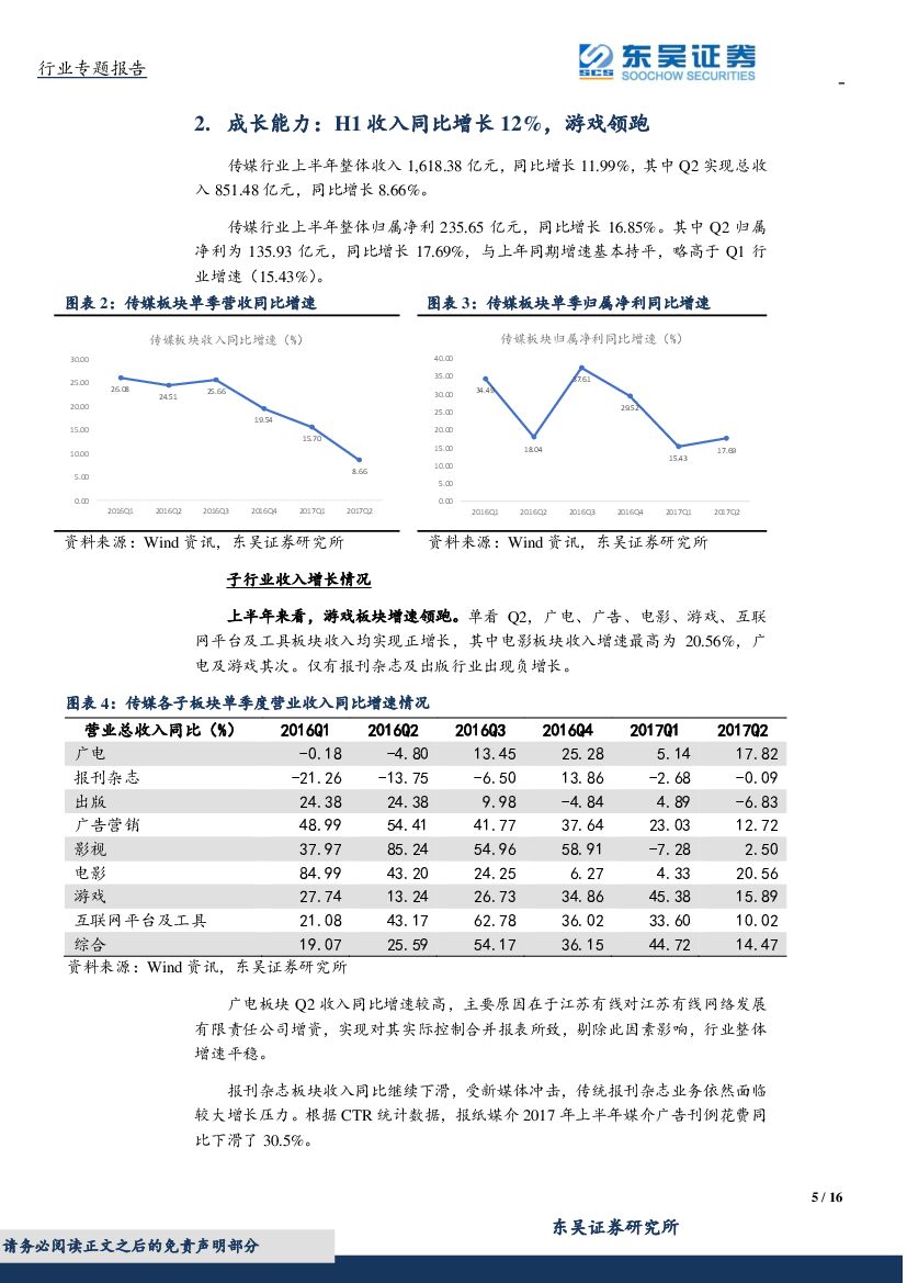 东吴证券:传媒行业2017年中报业绩综述:游戏领跑行业增长,盈利能力维持较高水平.pdf