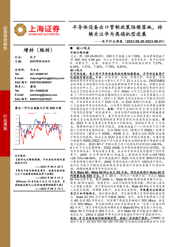 上海证券:电子行业周报:半导体设备出口管制政策陆续落地,持续关注华为高端机型进展.pdf