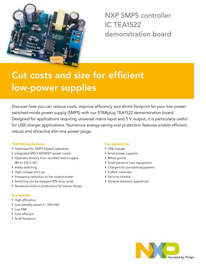NXP SMPS controller IC TEA1522 demonstration board 说明书NXP single 14-bit, 125 MSPS ADC with input buffer & CMOS/LVDS DDR outputs ADC1415Sxxx 说明书NXP universal LED driver UBA3070 说明书NXP Bright ideas for LED applications LED solutions for gaming, mobile, .pdf