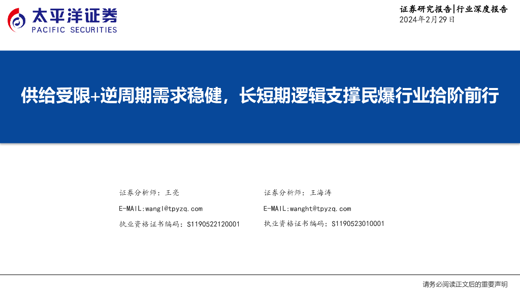 太平洋证券:民爆行业:供给受限+逆周期需求稳健,长短期逻辑支撑民爆行业拾阶前行.pdf