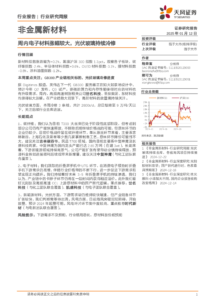 天风证券:非金属新材料行业研究周报:周内电子材料涨幅较大,光伏玻璃持续冷修.pdf