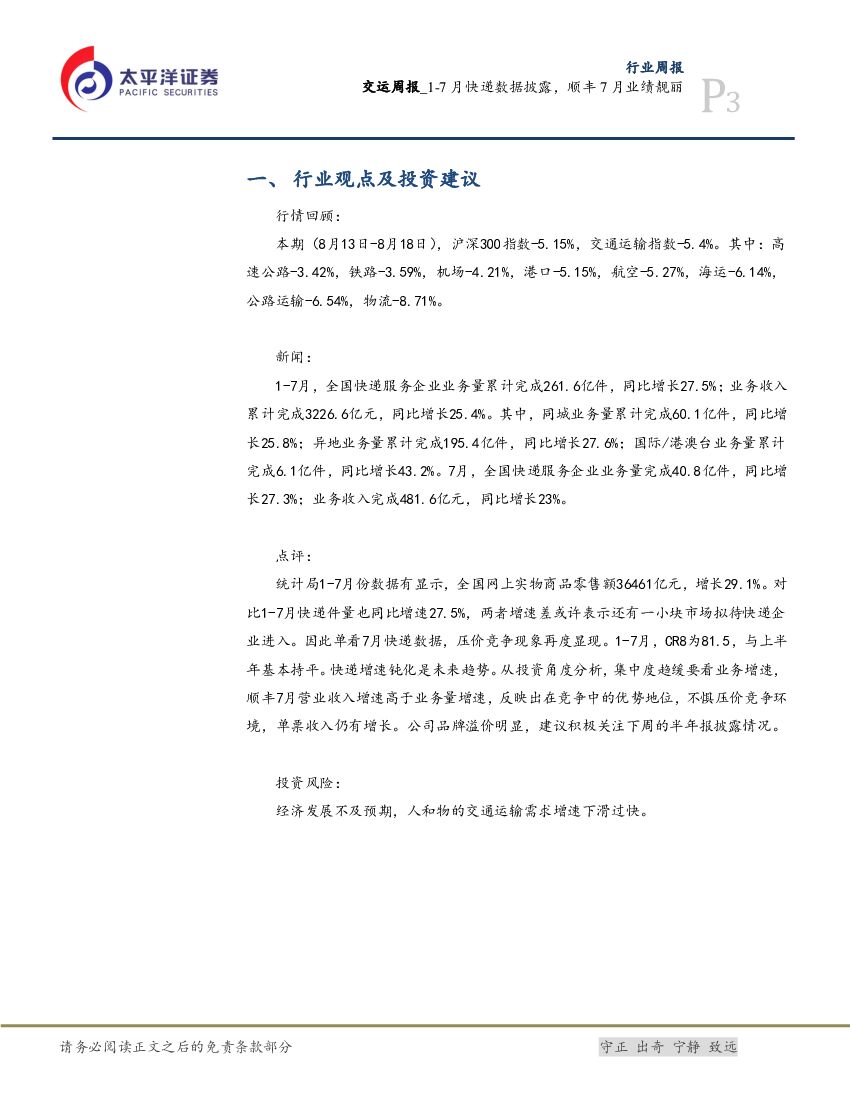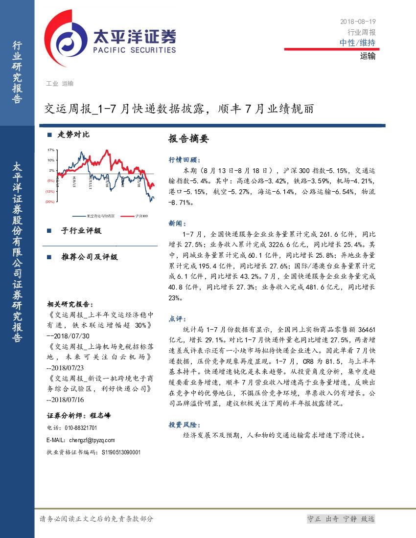 太平洋证券:交运周报:1-7月快递数据披露,顺丰7月业绩靓丽.pdf