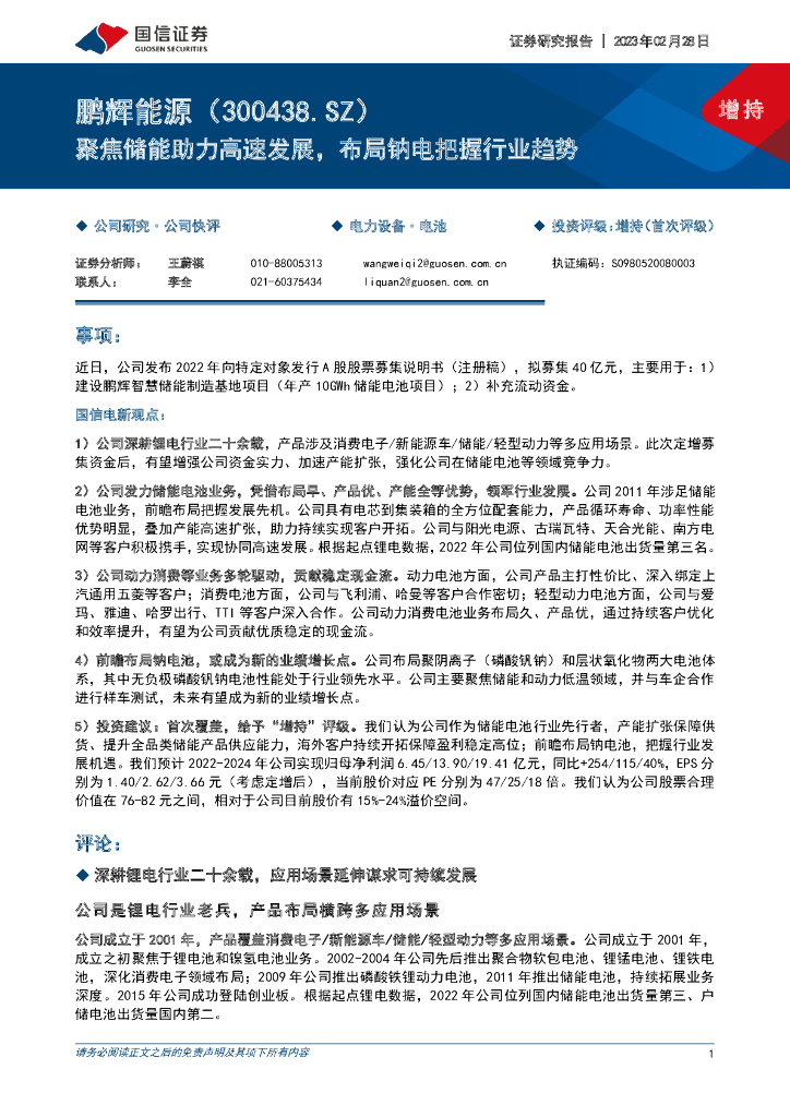 国信证券:鹏辉能源(300438)-聚焦储能助力高速发展,布局钠电把握行业趋势.pdf