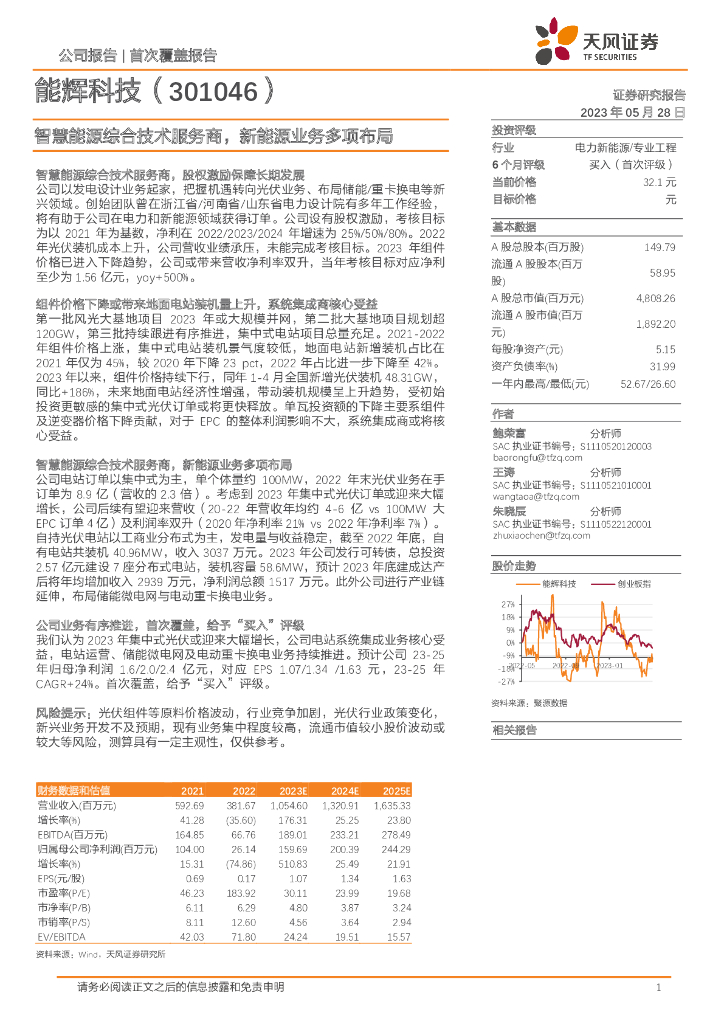 天风证券:能辉科技(301046)-智慧能源综合技术服务商,新能源业务多项布局.pdf