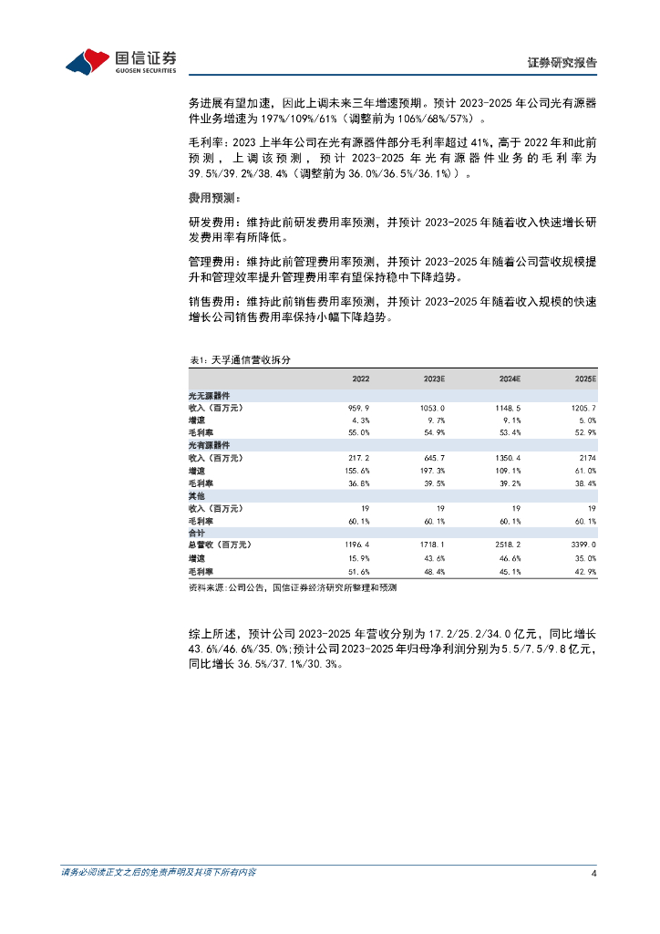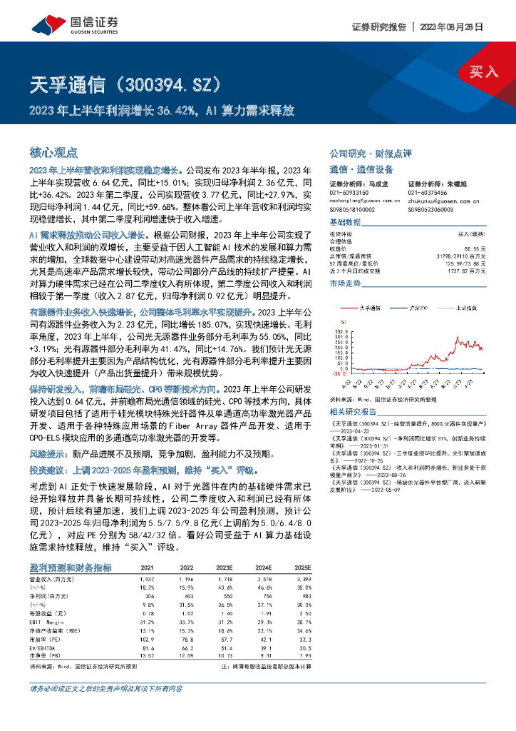 国信证券:天孚通信(300394)-2023年上半年利润增长36.42%,AI算力需求释放.pdf