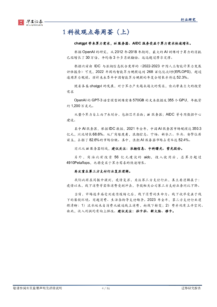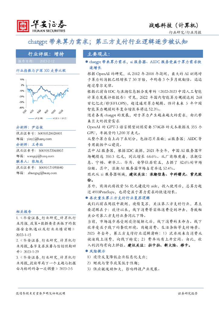 华安证券:战略科技(计算机)行业周报:chatgpt带来算力需求;第三方支付行业逻辑逐步被认知.pdf