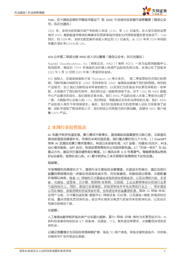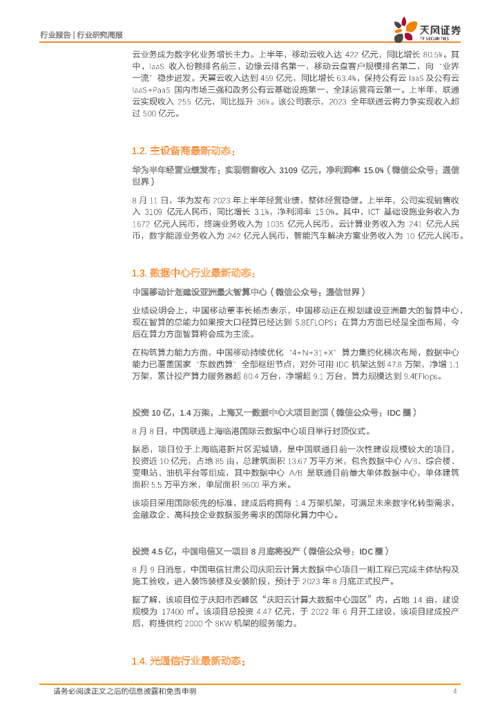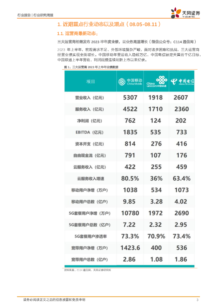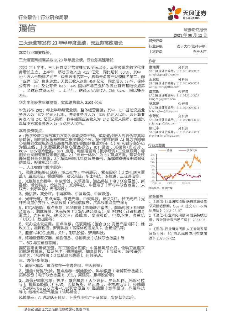天风证券:通信行业研究周报:三大运营商发布23年半年度业绩,云业务高速增长.pdf