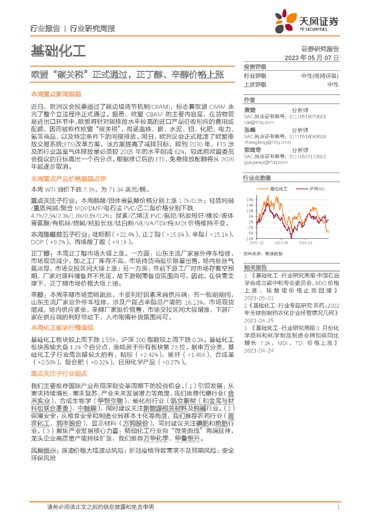 天风证券:基础化工行业研究周报:欧盟“碳关税”正式通过,正丁醇、辛醇价格上涨.pdf