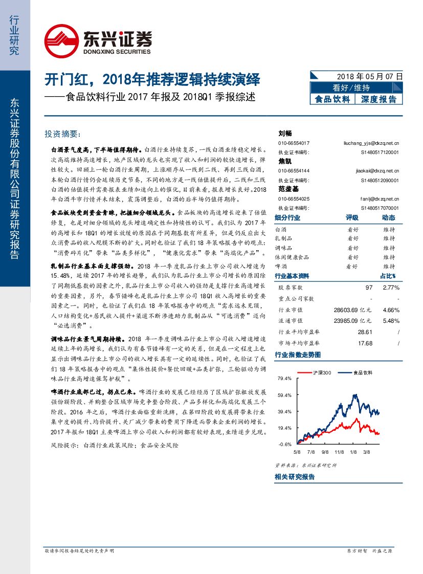 东兴证券:食品饮料行业2017年报及2018Q1季报综述:开门红,2018年推荐逻辑持续演绎.pdf