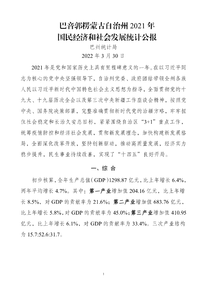 巴音郭楞州2021年国民经济和社会发展统计公报.pdf