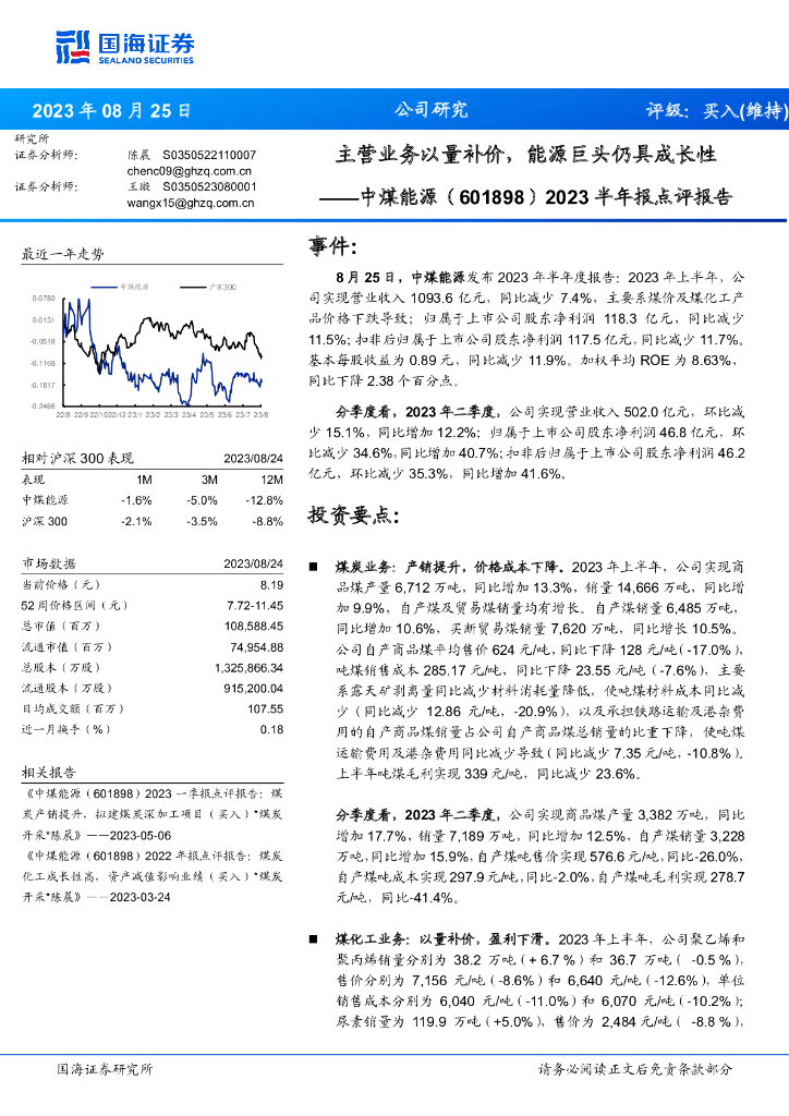 国海证券:中煤能源(601898)-2023半年报点评报告:主营业务以量补价,能源巨头仍具成长性.pdf