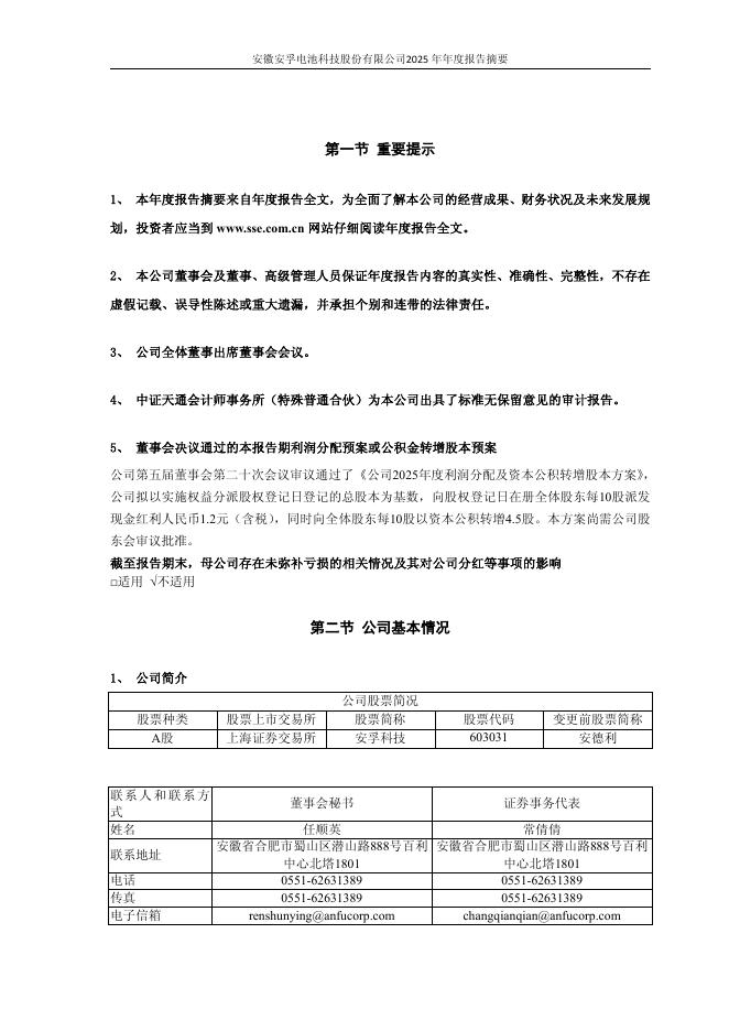 603031-安孚科技:安徽安孚电池科技股份有限公司2025年年度报告摘要.pdf