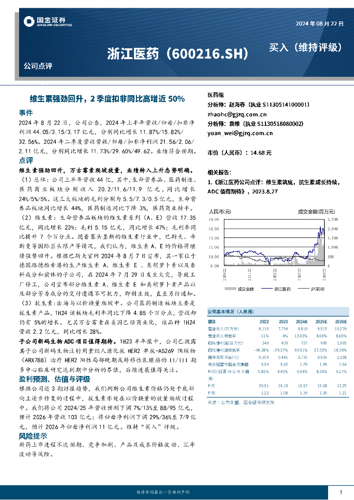 国金证券:浙江医药(600216)-公司点评:维生素强劲回升,2季度扣非同比高增近50%.pdf