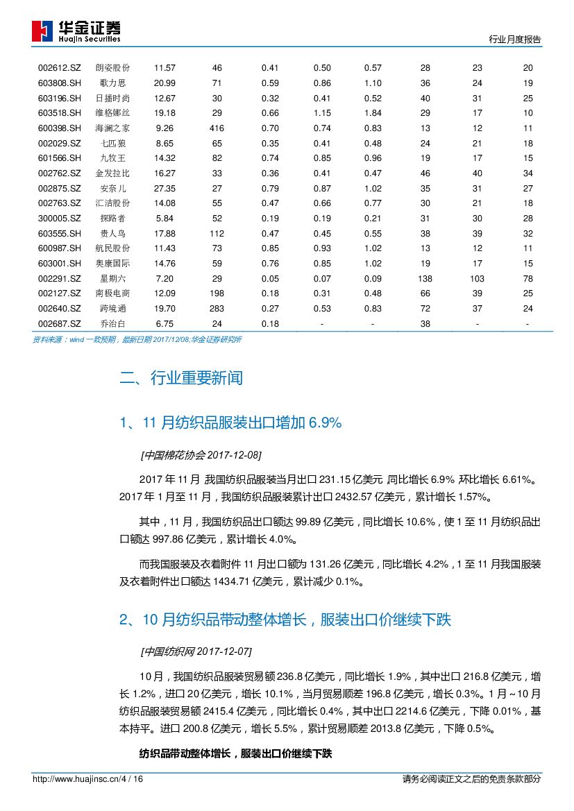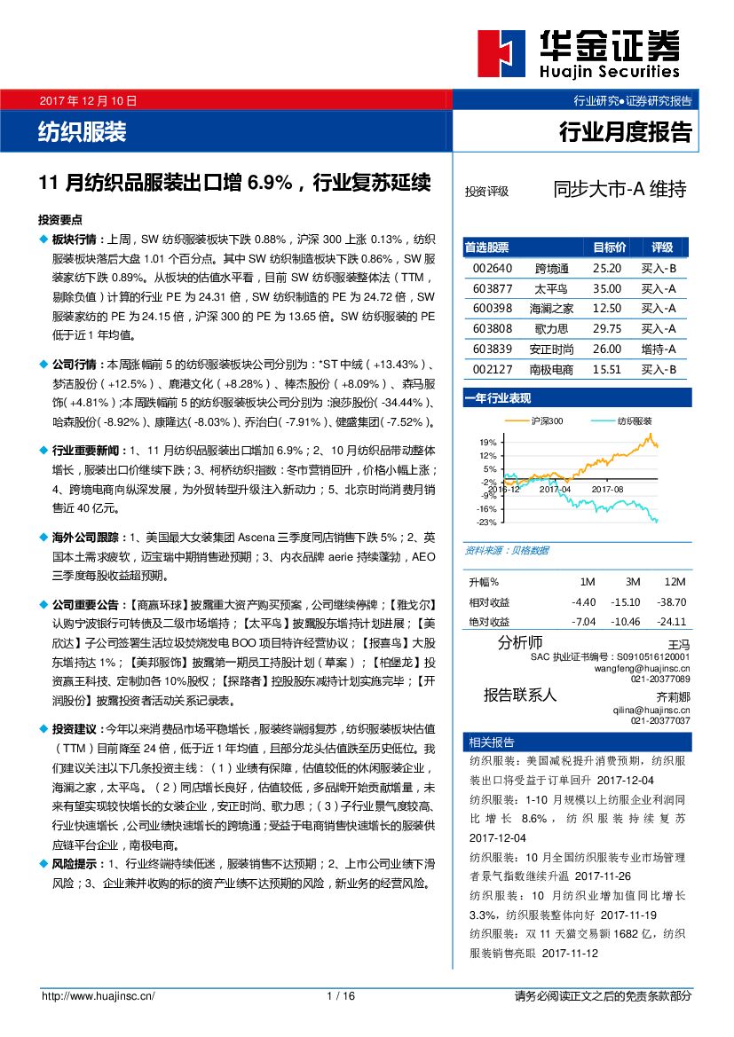 华金证券:纺织服装行业月度报告:11月纺织品服装出口增6.9%,行业复苏延续.pdf