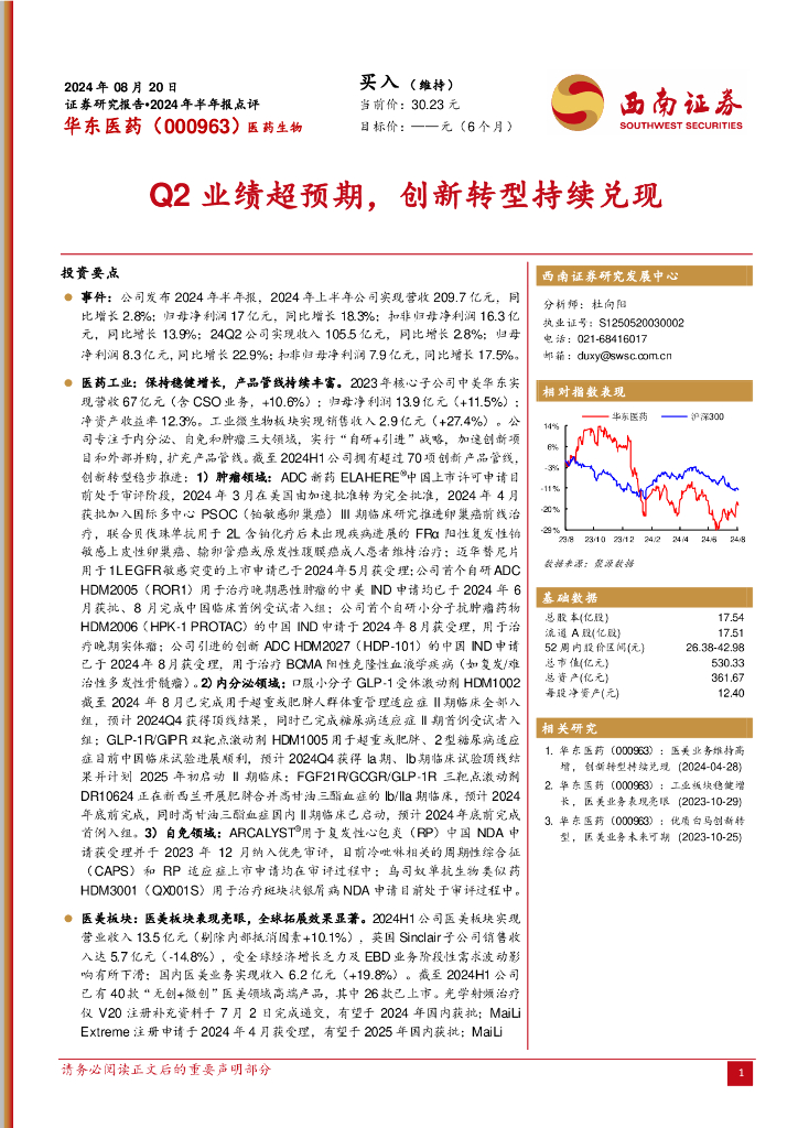 西南证券:华东医药(000963)-Q2业绩超预期,创新转型持续兑现.pdf