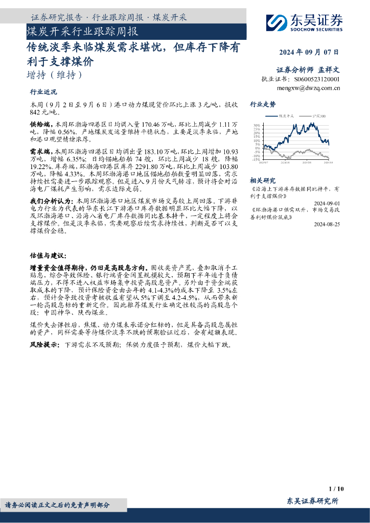 东吴证券:煤炭开采行业跟踪周报:传统淡季来临煤炭需求堪忧,但库存下降有利于支撑煤价.pdf